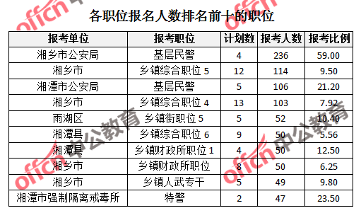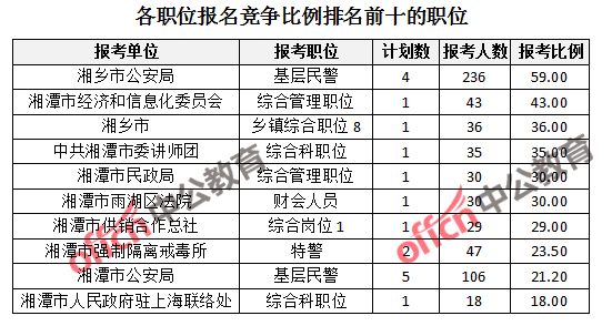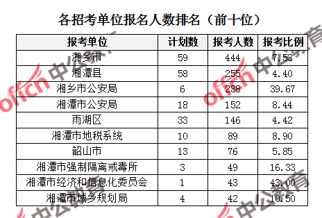 為幫助廣大考生更清晰的了解報(bào)名情況,中公教育整理了湘潭市各招考單位的報(bào)名人數(shù)排名以及競(jìng)爭(zhēng)比例排名,供廣大考生參考:
