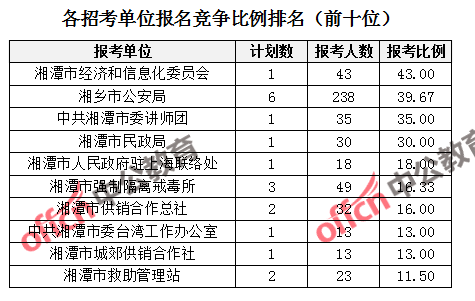 競(jìng)爭(zhēng)熱門招考單位,前三位依次是:湘潭市經(jīng)濟(jì)和信息化委員會(huì)(競(jìng)爭(zhēng)比例43:1)、湘鄉(xiāng)市公安局(競(jìng)爭(zhēng)比例39.67:1)、中共湘潭市委團(tuán)(競(jìng)爭(zhēng)比例35:1)。