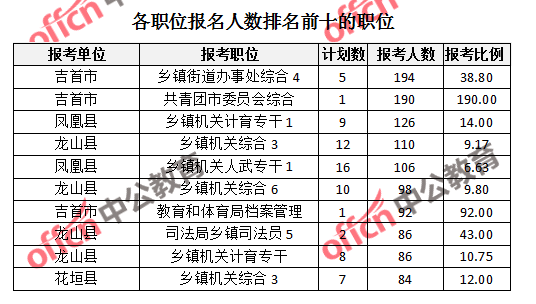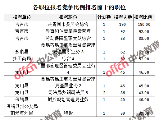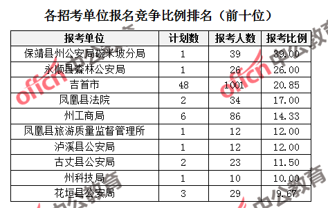 競爭熱門招考單位,前三位依次是:保靖縣州公安局碗米坡分局(競爭比例39:1)、永順縣森林公安局(競爭比例26:1)、吉首市(競爭比例20.85:1)。