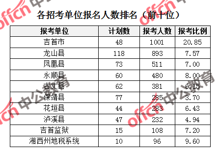 為幫助廣大考生更清晰的了解報(bào)名情況,中公教育整理了湘西市各招考單位的報(bào)名人數(shù)排名以及競爭比例排名,供廣大考生參考: