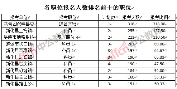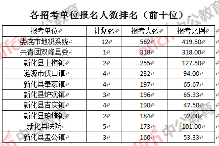 競(jìng)爭(zhēng)熱門(mén)招考單位,前三位依次是:婁底市地稅系統(tǒng) (競(jìng)爭(zhēng)比例419:1)、共青團(tuán)雙峰縣委(競(jìng)爭(zhēng)比例318:1)和新化縣上梅鎮(zhèn)(競(jìng)爭(zhēng)比例127:1)。