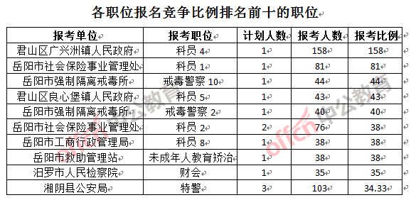 競(jìng)爭(zhēng)最熱門職位,前三依次是:君山區(qū)廣興洲鎮(zhèn)人民政府科員4(競(jìng)爭(zhēng)比例158:1)、岳陽市社會(huì)保險(xiǎn)事業(yè)管理處科員1(競(jìng)爭(zhēng)比例81:1)和岳陽市強(qiáng)制隔離戒毒所戒毒警察10(競(jìng)爭(zhēng)比例44:1)。