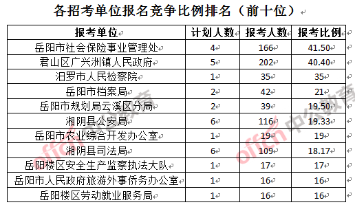 競爭熱門招考單位,前三位依次是:岳陽市社會(huì)保險(xiǎn)事業(yè)管理處(競爭比例41.5:1)、君山區(qū)廣興洲鎮(zhèn)人民政府(競爭比例40.4:1)和汨羅市人民檢察院(競爭比例35:1)。