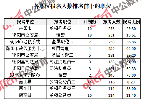 為幫助廣大考生更清晰的了解報(bào)名情況,中公網(wǎng)校整理了衡陽(yáng)市各職位的報(bào)名人數(shù)排名以及競(jìng)爭(zhēng)比例排名,供廣大考生參考: