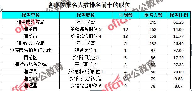 為幫助廣大考生更清晰的了解報名情況,中公網校整理了湘潭市各職位的報名人數(shù)排名以及競爭比例排名,供廣大考生參考: