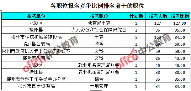 競爭熱門職位,前三位依次是:北湖區(qū)教育局土建(競爭比例127:1)、桂陽縣人力資源和社會局綜合(競爭比例95:1)和郴州市住房和城鄉(xiāng)建設(shè)局土建(競爭比例84.5:1)。