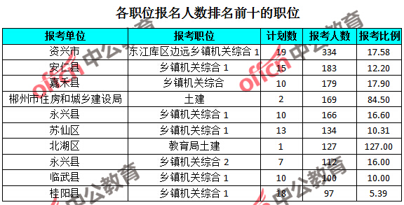 為幫助廣大考生更清晰的了解報名情況,中公網(wǎng)校整理了湖南郴州各職位的報名人數(shù)排名以及競爭比例排名,供廣大考生參考: