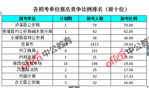 競爭熱門招考單位,前三位依次是:瀘溪縣公安局(競爭比例70:1)、保靖縣州公安局碗米坡分局(競爭比例42:1)和永順縣森林公安局(競爭比例36:1)。