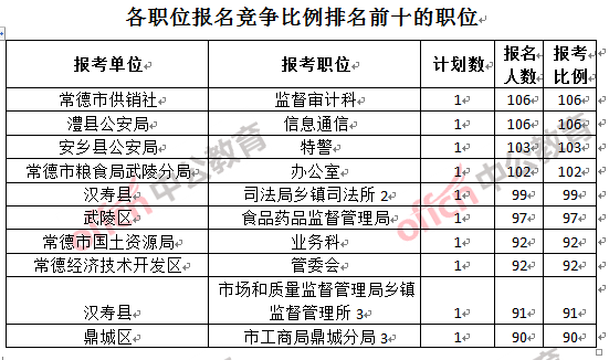 競(jìng)爭(zhēng)熱門(mén)職位,前三位依次是:常德市供銷(xiāo)社監(jiān)督審計(jì)科和澧縣公安局信息通信(競(jìng)爭(zhēng)比例106:1)和安鄉(xiāng)縣公安局特警(競(jìng)爭(zhēng)比例103:1)。