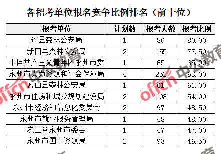 競爭熱門招考單位,前三位依次是:道縣森林公安局(競爭比例80:1)、新田縣森林公安局(競爭比例77.5:1)、中國共產(chǎn)主義青年團(tuán)永州市委(競爭比例65:1)。