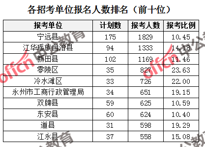 為幫助廣大考生更清晰的了解報(bào)名情況,中公網(wǎng)校整理了永州市各招考單位的報(bào)名人數(shù)排名以及競爭比例排名,供廣大考生參考: