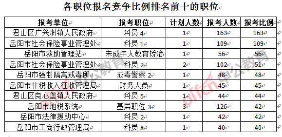 競(jìng)爭(zhēng)最熱門職位,前三位依次是:君山區(qū)廣興洲鎮(zhèn)人民政府科員4(競(jìng)爭(zhēng)比例163:1)、岳陽市社會(huì)保險(xiǎn)事業(yè)管理處科員1(競(jìng)爭(zhēng)比例109:1)和岳陽市救助管理站未成年人教育矯治(競(jìng)爭(zhēng)比例56:1)。