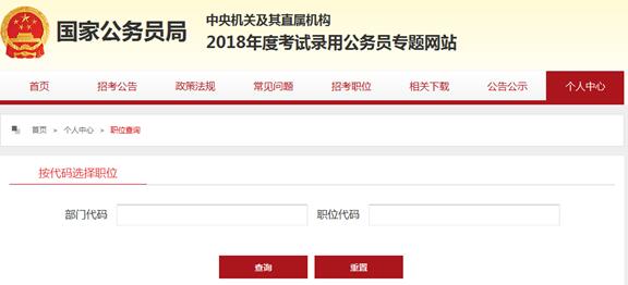 在選職位時(shí)首先需要輸入兩個(gè)代碼:部門代碼和職位代碼,考生要打開職位表,選出自己能報(bào)考的職位,把兩個(gè)代碼填寫完之后 點(diǎn)擊“查詢”,即可看到選報(bào)職位的詳細(xì)信息,如果輸入錯(cuò)誤需要重新輸入,那樣的話點(diǎn)擊“重置”,就可以重新選擇。