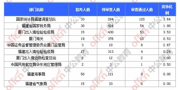 截止到31日9時,通過審核人數(shù)前三位的部門依次是:國家統(tǒng)計局福建調(diào)查總隊、福建省國家稅務(wù)局、廈門出入境檢驗(yàn)檢疫局,三部門通過審核總?cè)藬?shù)達(dá)227人,占通過審核總?cè)藬?shù)的90%。