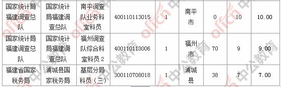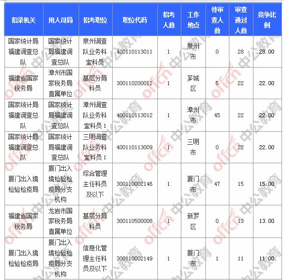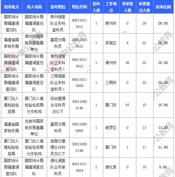 報(bào)名通過(guò)審核人數(shù)前十的職位主要集中在國(guó)家統(tǒng)計(jì)局福建調(diào)查總隊(duì)、福建省國(guó)家稅務(wù)局、廈門出入境檢驗(yàn)檢疫局等部門,具體信息如下: