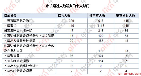 截止到31日10時(shí),通過(guò)審核人數(shù)前三位的部門依次是:上海市國(guó)家稅務(wù)局,上海海關(guān),國(guó)家海洋局東海分局,三部門通過(guò)審核總?cè)藬?shù)達(dá)616人,占通過(guò)審核總?cè)藬?shù)的83.58%。