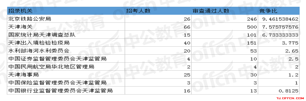 為幫助廣大考生更清晰的了解今日報(bào)名情況,中公網(wǎng)校整理了審核通過人數(shù)前十位的部門以及競爭比例最激烈的十大部門,供廣大考生參考: