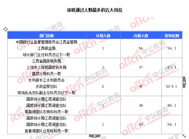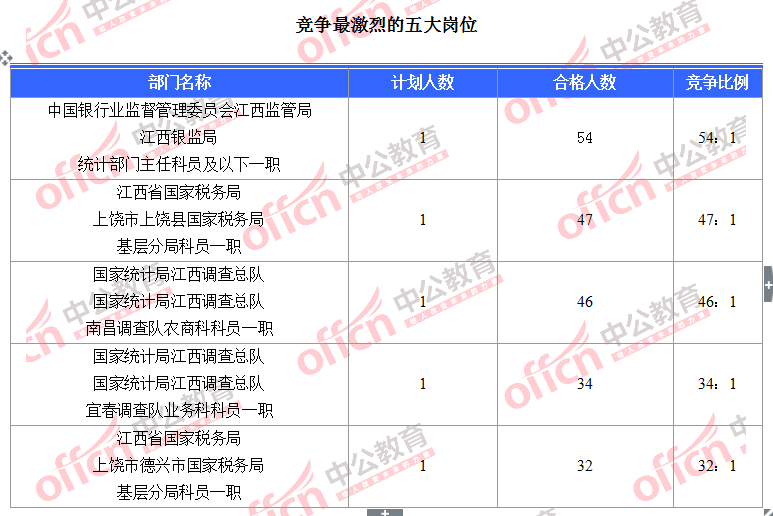 截至10月31日18時,據(jù)江西中公教育統(tǒng)計,國考職位中工作地點在江西的職位中共有2464人報名,其中1288人待審核,1176人已通過,競爭的崗位為江西銀監(jiān)局統(tǒng)計部門主任科員及以下一職(職位代碼400148101003),競爭比為54:1。