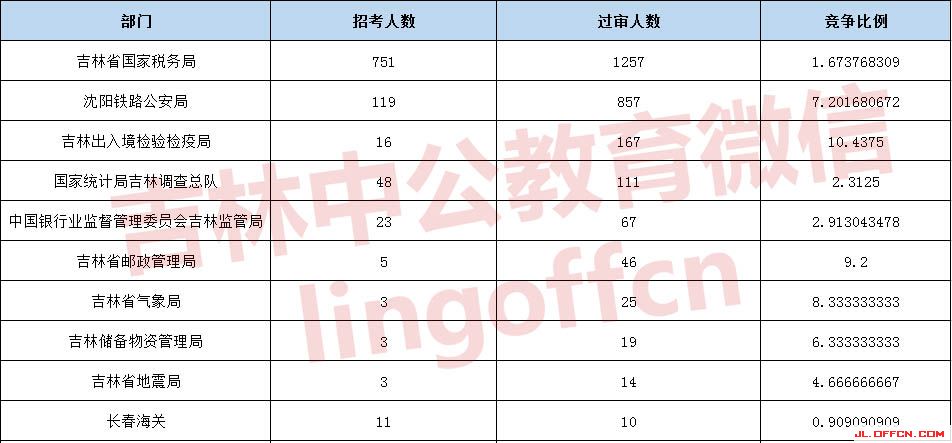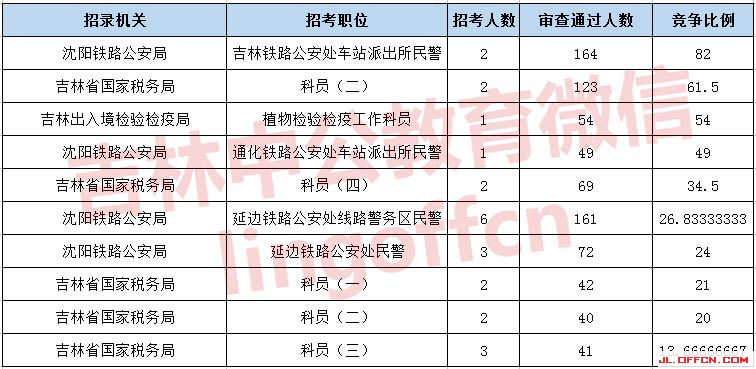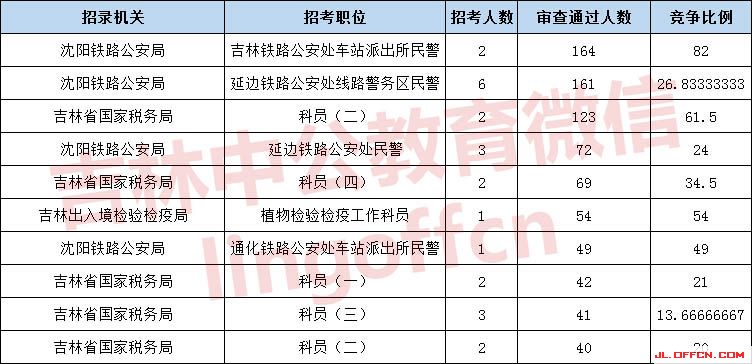 報(bào)名通過(guò)審核人數(shù)前十的職位主要集中在沈陽(yáng)鐵路公安局、吉林國(guó)家稅務(wù)局、吉林出入境檢疫檢驗(yàn)局等部門,具體信息如下: