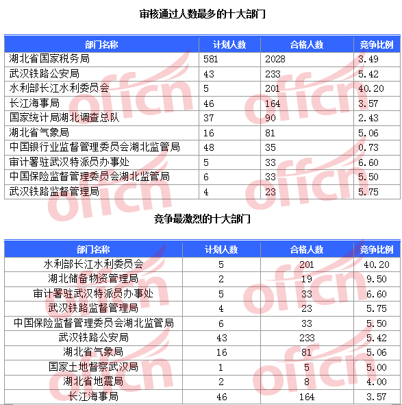 報(bào)名通過審核人數(shù)前十的職位主要集中在水利部長江水利委員會(huì)、湖北省國家稅務(wù)局、長江海事局等部門,具體信息如下: