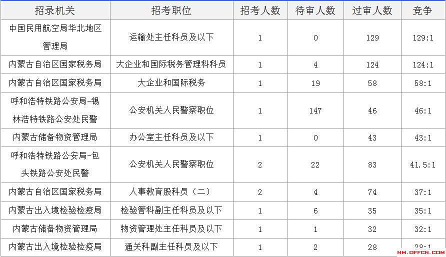報(bào)名通過審核人數(shù)前十的職位主要集中在內(nèi)蒙古自治區(qū)國家稅務(wù)局,沈陽鐵路局、呼和浩特鐵路局以及中國民用航空局華北地區(qū)管理局等部門,具體信息如下: