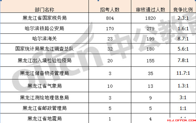 報(bào)名通過(guò)審核人數(shù)前十的職位主要集中在黑龍江省國(guó)家稅務(wù)局、國(guó)家統(tǒng)計(jì)局黑龍江調(diào)查、黑龍江出入境檢驗(yàn)檢疫局等部門。