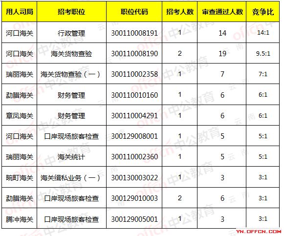 2018國(guó)家公務(wù)員海關(guān)報(bào)名人數(shù)為319人,115人審核通過(guò)。截止31日18時(shí)昆明海關(guān)河口海關(guān)的行政管理,職位代碼:300110008191,工作地點(diǎn)河口瑤族自治縣,招錄1人,審查通過(guò)人數(shù)為14人,待審核9人,暫時(shí)競(jìng)爭(zhēng)比為14:1,具體信息如下: