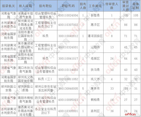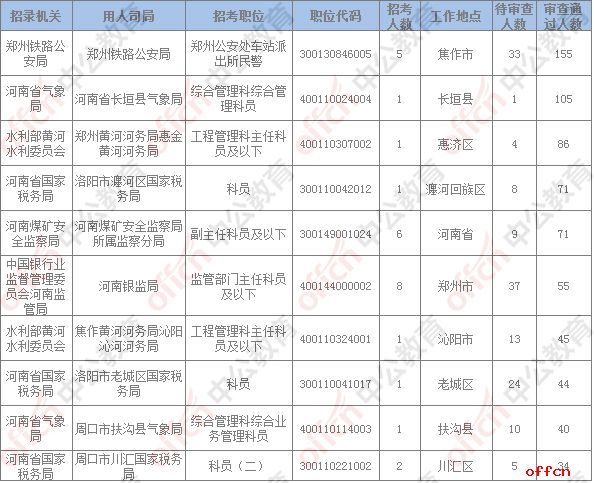 報名通過審核人數(shù)前十的職位主要集中在河南省國家稅務局、鄭州鐵路公安局、中國銀行業(yè)監(jiān)督管理委員會河南監(jiān)管局、水利部黃河水利委員會等部門,具體信息如下: