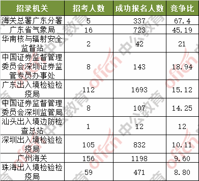 截至11月1日16時(shí),據(jù)中公網(wǎng)校統(tǒng)計(jì),國(guó)考職位中工作地點(diǎn)在廣東的職位通過(guò)審核總?cè)藬?shù)為18272人,共有365個(gè)職位無(wú)人通過(guò)審核,平均競(jìng)爭(zhēng)比例為6.35:1。