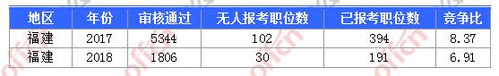 截至11月1日16時(shí),據(jù)中公網(wǎng)校統(tǒng)計(jì),國考職位中工作地點(diǎn)在福建的職位3063人待審 1806人通過審核,共報(bào)名4869人,其中有30個(gè)職位無人報(bào)名,平均競爭比例為6.91:1。