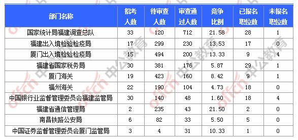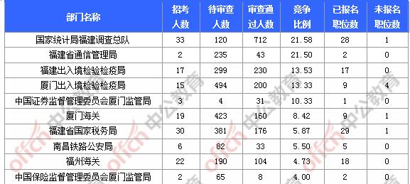截止到1日16時(shí),通過審核人數(shù)前三位的部門依次是:國家統(tǒng)計(jì)局福建調(diào)查總隊(duì)、福建出入境檢驗(yàn)檢疫局、廈門出入境檢驗(yàn)檢疫局,三部門通過審核總?cè)藬?shù)達(dá)1142人,占通過審核總?cè)藬?shù)的63.23%。