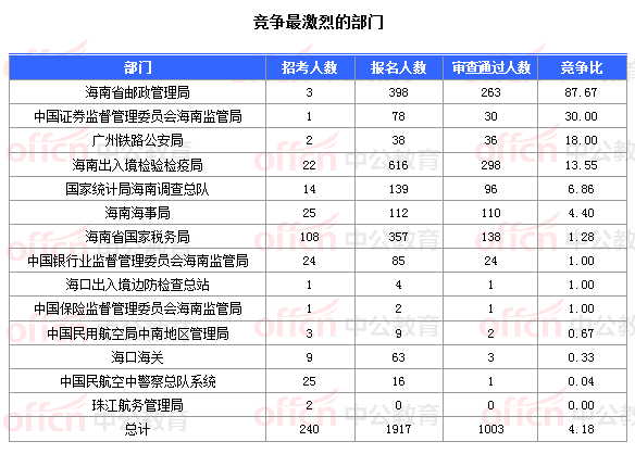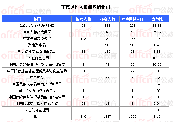 截止到1日16時(shí),通過審核人數(shù)前三位的部門依次是:海南出入境檢驗(yàn)檢疫局、海南省郵政管理局、海南省國家稅務(wù)局,三部門通過審核總?cè)藬?shù)達(dá)699人,占通過審核總?cè)藬?shù)的69.69%。