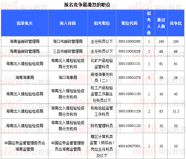 報名通過審核人數(shù)前十的職位主要集中在海南省郵政管理局、海南出入境檢驗檢疫局、海南海事局等部門,具體信息如下: