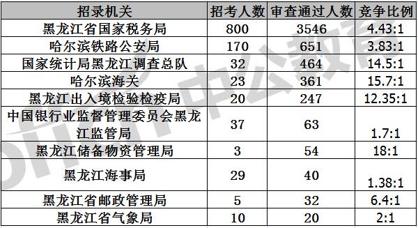 截止到11月1日16時(shí),通過(guò)審核人數(shù)前三位的部門依次是:黑龍江省國(guó)家稅務(wù)局、哈爾濱鐵路公安局、國(guó)家統(tǒng)計(jì)局黑龍江調(diào)查總隊(duì),三部門通過(guò)審核總?cè)藬?shù)達(dá)4661人,占通過(guò)審核總?cè)藬?shù)的84.3%。