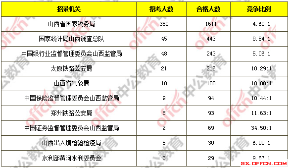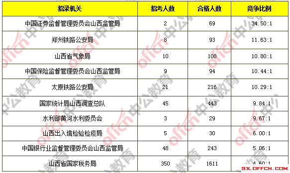 截至11月1日16時(shí),據(jù)中公網(wǎng)校統(tǒng)計(jì),國考職位中工作地點(diǎn)在山西的職位通過審核總?cè)藬?shù)為3009人,和去年同期相比合格人數(shù)減少了309人,截止目前共有44個(gè)職位無人報(bào)考,平均競爭比例為5.67:1,和去年同期競爭比基本持平。