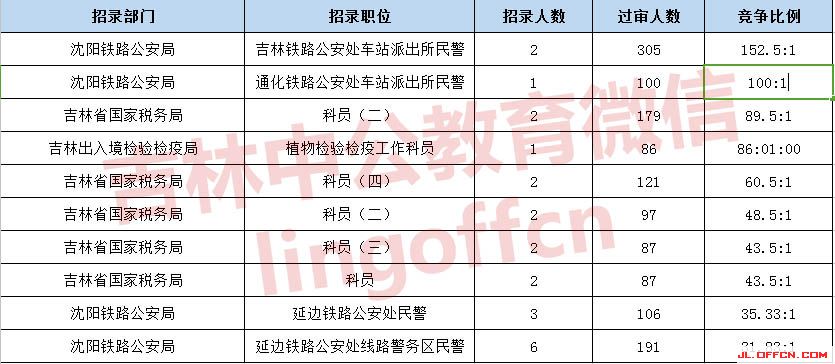 報名通過審核人數(shù)前十的職位主要集中在沈陽鐵路公安局、吉林國家稅務局、吉林出入境檢疫檢驗局等部門,具體信息如下: