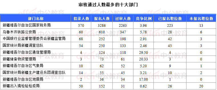 為幫助廣大考生更清晰的了解今日報名情況,中公網(wǎng)校整理了審核通過人數(shù)前十位的部門以及競爭比例最激烈的十大部門,供廣大考生參考: