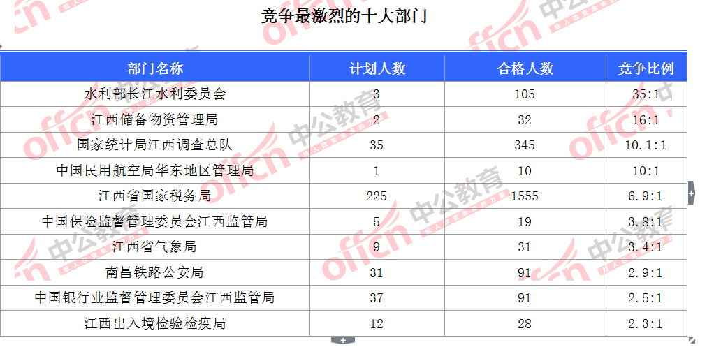截至11月1日17時(shí),據(jù)中公網(wǎng)校統(tǒng)計(jì),國(guó)考職位中工作地點(diǎn)在江西的職位通過(guò)審核總?cè)藬?shù)為2322人,共有34個(gè)職位無(wú)人報(bào)名,平均競(jìng)爭(zhēng)比例為6.2:1。