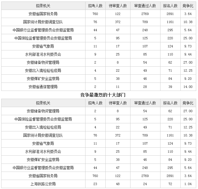 為幫助廣大考生更清晰的了解今日?qǐng)?bào)名情況,中公網(wǎng)校整理了審核通過(guò)人數(shù)前十位的部門以及競(jìng)爭(zhēng)比例最激烈的十大部門,供廣大考生參考: