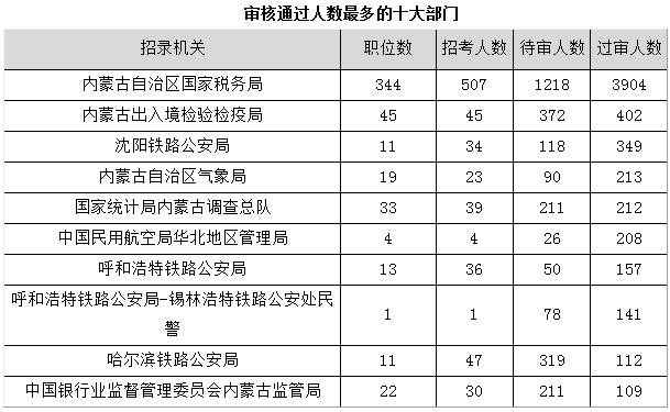 截止到11月1日16時,通過審核人數(shù)前三位的部門依次是:內(nèi)蒙古自治區(qū)國家稅務(wù)局、內(nèi)蒙古出入境檢驗檢疫局、沈陽鐵路公安局,三部門通過審核總?cè)藬?shù)達4655人,占通過審核總?cè)藬?shù)的73.59%。