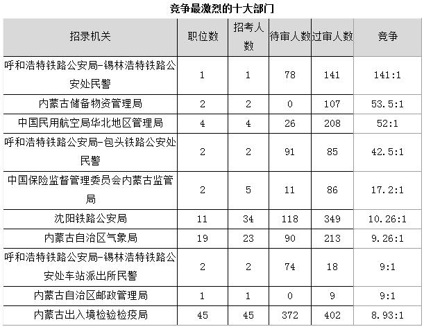 為幫助廣大考生更清晰的了解今日報名情況,中公網(wǎng)校整理了審核通過人數(shù)前十位的部門以及競爭比例最激烈的十大部門,供廣大考生參考: