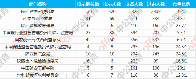 截至到2日9時,通過審核人數(shù)前三位的部門依次是:陜西省國家稅務(wù)局、西安鐵路公安局、國家統(tǒng)計局陜西調(diào)查總隊,三部門通過審核總?cè)藬?shù)達4006人,占通過審核總?cè)藬?shù)的76.6%。 一、各部門報名人數(shù)分析