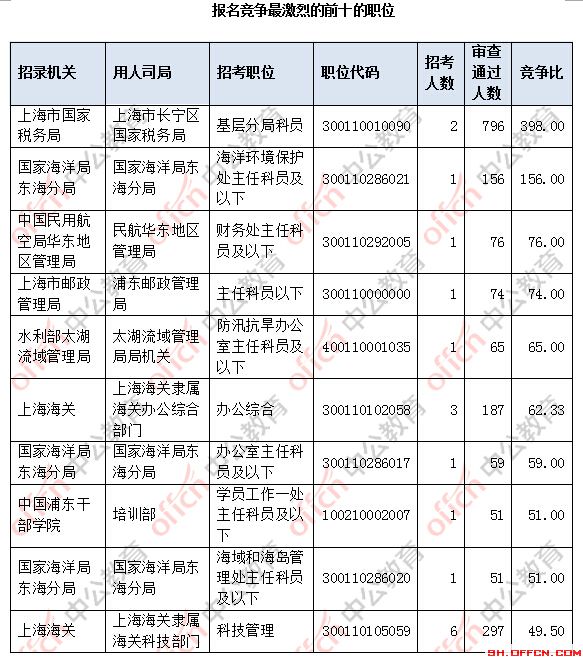 截止到2日9時,工作地點在上海的職位共有49個無人報考,占全部職位的15.17%,主要集中在上海海事局、上海市國家稅務(wù)局以及上海鐵路監(jiān)督管理局,下面是無人報考職位一覽表,中公網(wǎng)校專家建議廣大考生多關(guān)注一些較冷職位,避免激烈競爭,結(jié)合自身條件,找到屬于自己的職位。