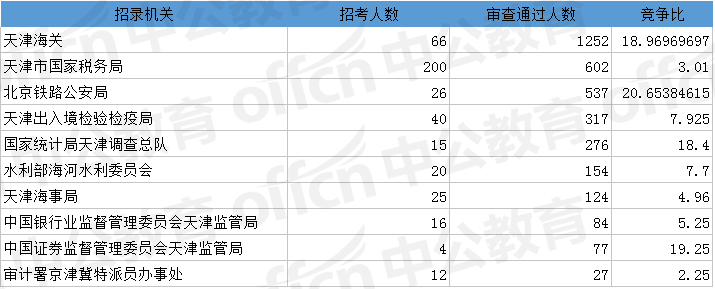 為幫助廣大考生更清晰的了解今日?qǐng)?bào)名情況,中公網(wǎng)校整理了審核通過人數(shù)前十位的部門以及競(jìng)爭(zhēng)比例最激烈的十大部門,供廣大考生參考:
