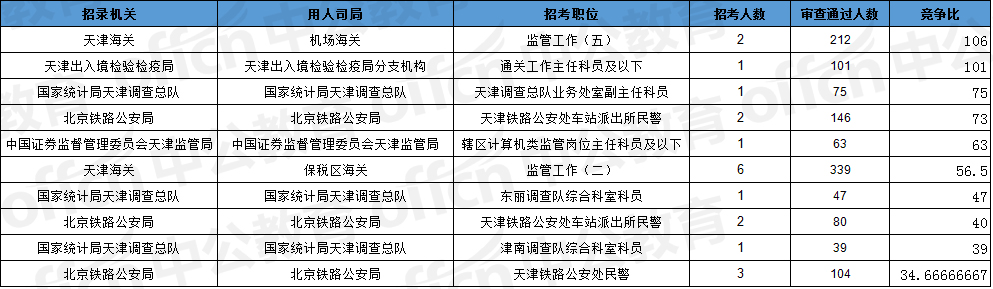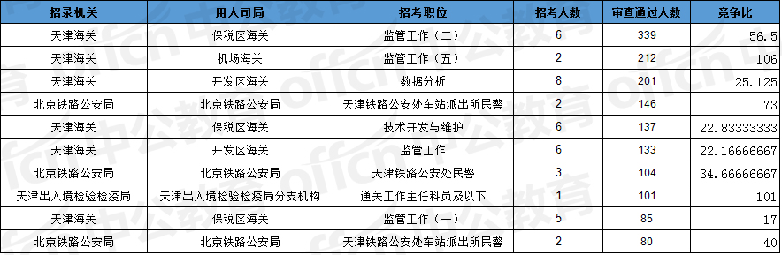 報(bào)名通過(guò)審核人數(shù)前十的職位主要集中在天津海關(guān)、北京鐵路公安局、天津出入境檢驗(yàn)檢疫局等部門(mén),具體信息如下:
