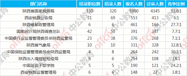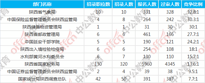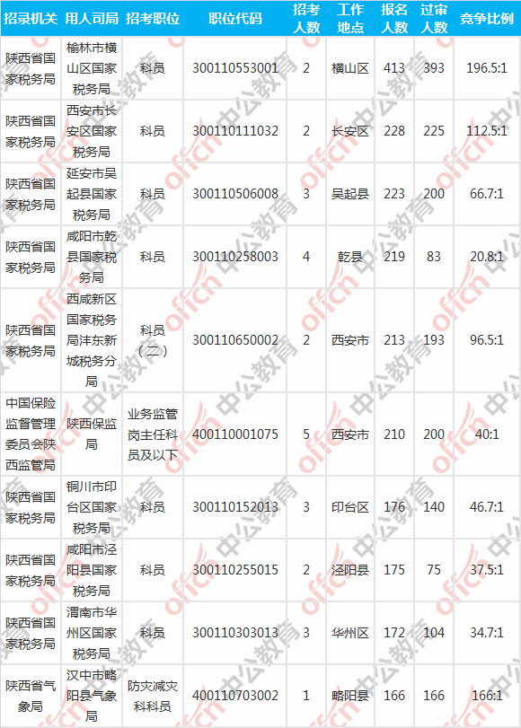 報(bào)名人數(shù)前十的職位主要集中在陜西省國(guó)家稅務(wù)局、中國(guó)保險(xiǎn)監(jiān)督管理委員會(huì)陜西監(jiān)管局、陜西省氣象局等部門,具體信息如下: