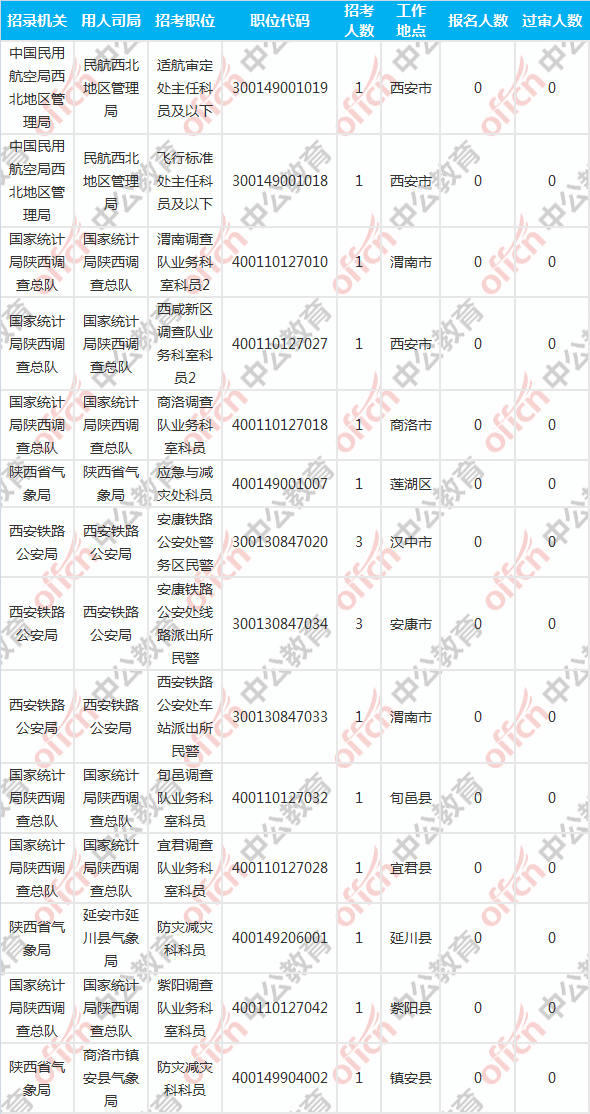 截至到2日16時(shí),工作地點(diǎn)在陜西的職位共有14個(gè)無人報(bào)考,占全部職位的4.87%。下面是無人報(bào)考職位一覽表,中公網(wǎng)校專家建議廣大考生多關(guān)注一些較冷職位,避免激烈競爭,結(jié)合自身?xiàng)l件,找到屬于自己的職位。