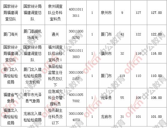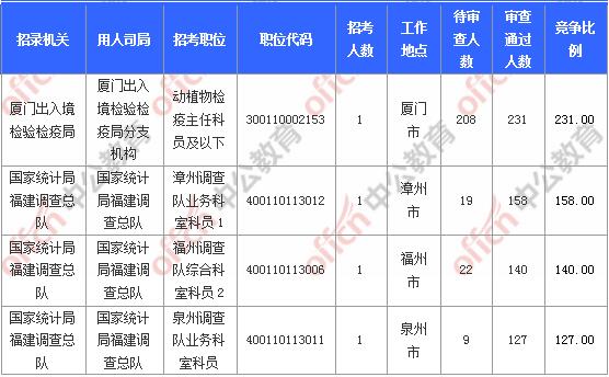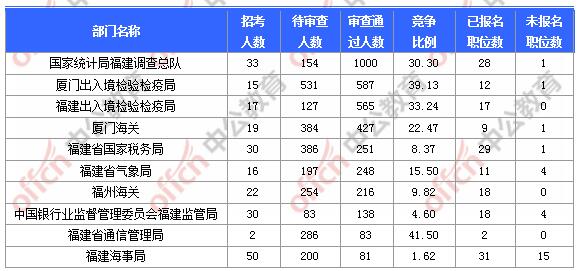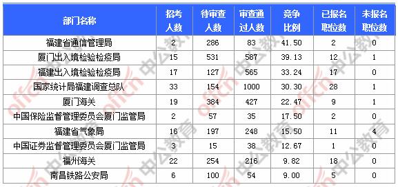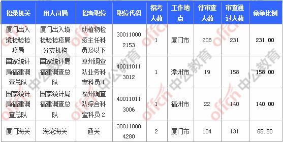 報(bào)名通過審核人數(shù)前十的職位主要集中在廈門出入境檢驗(yàn)檢疫局、國家統(tǒng)計(jì)局福建調(diào)查總隊(duì)、廈門海關(guān)等部門,具體信息如下: