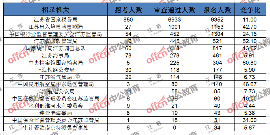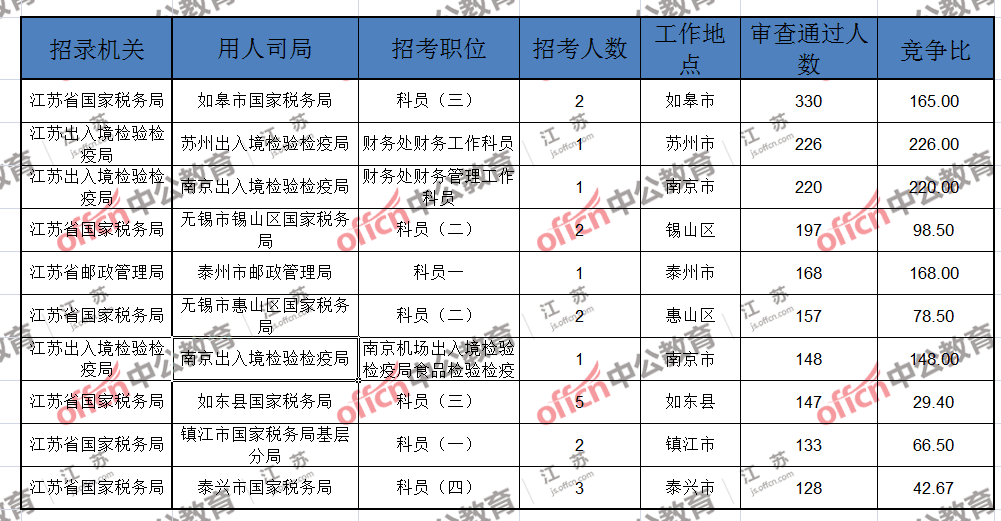 報(bào)名通過(guò)審核人數(shù)前十的職位主要集中在江蘇出入境檢驗(yàn)檢疫局、江蘇省郵政管理局、江蘇省國(guó)家稅務(wù)局等部門,具體信息如下: