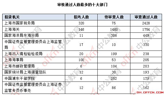 截止到2日16時(shí),通過審核人數(shù)前三位的部門依次是:上海市國家稅務(wù)局,上海海關(guān),國家海洋局東海分局,三部門通過審核總?cè)藬?shù)達(dá)4631人,占通過審核總?cè)藬?shù)的70.63%。